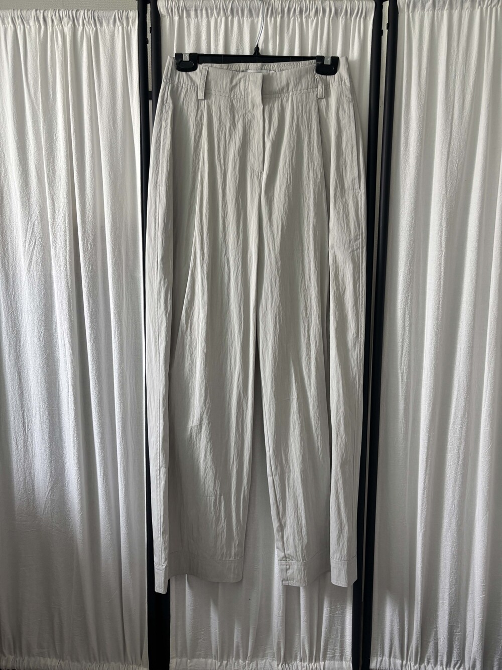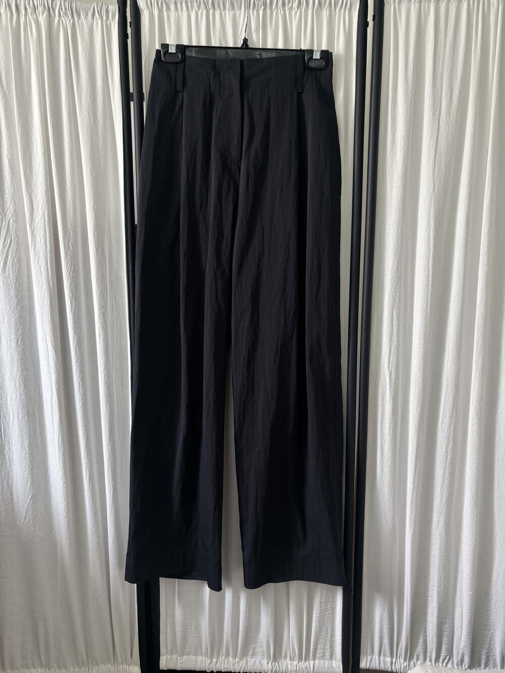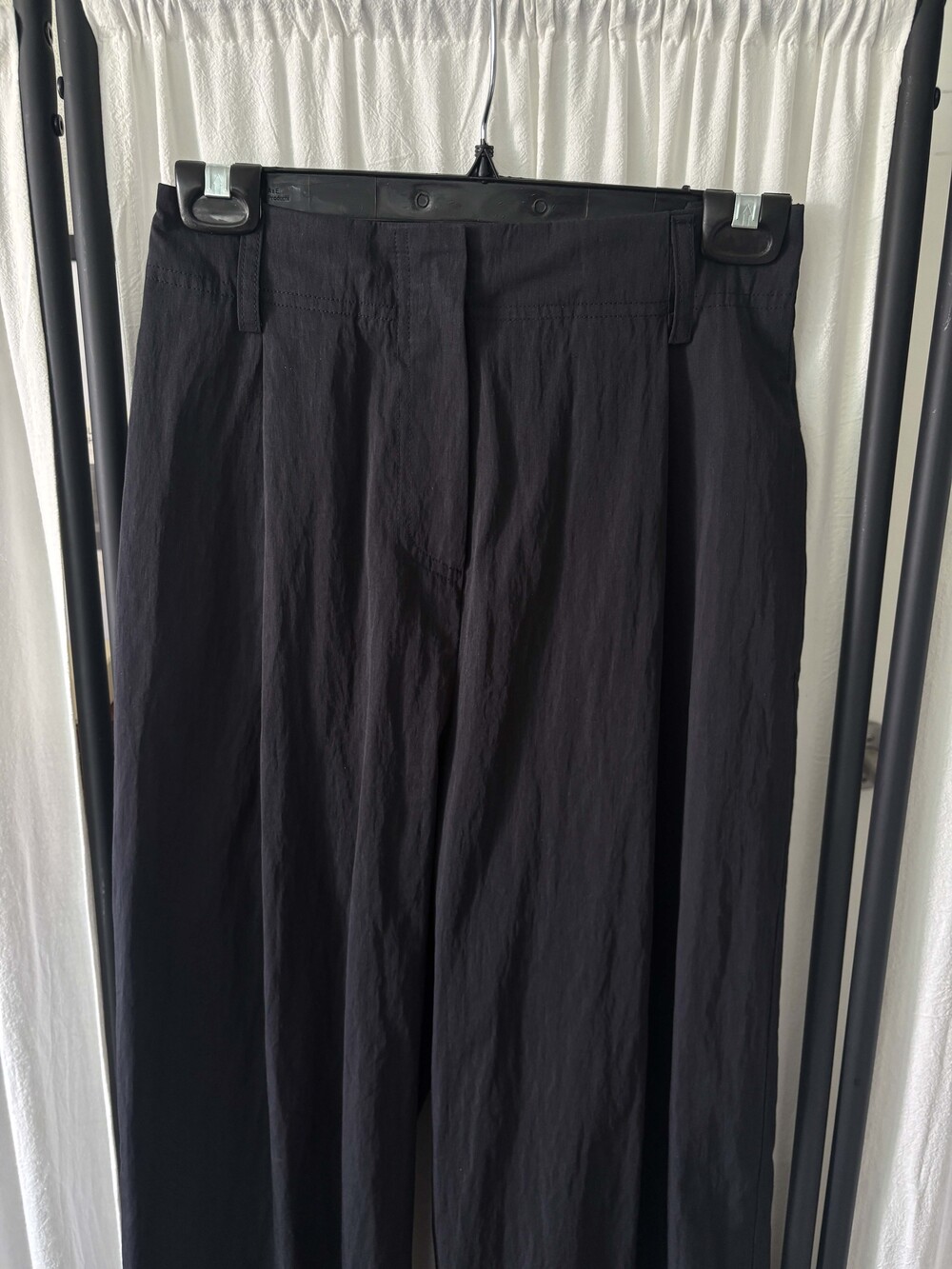 S 허리 34 밑위 38.5 힙 48 허벅지 28 밑단 25 총장 104.5