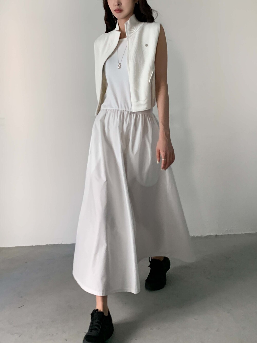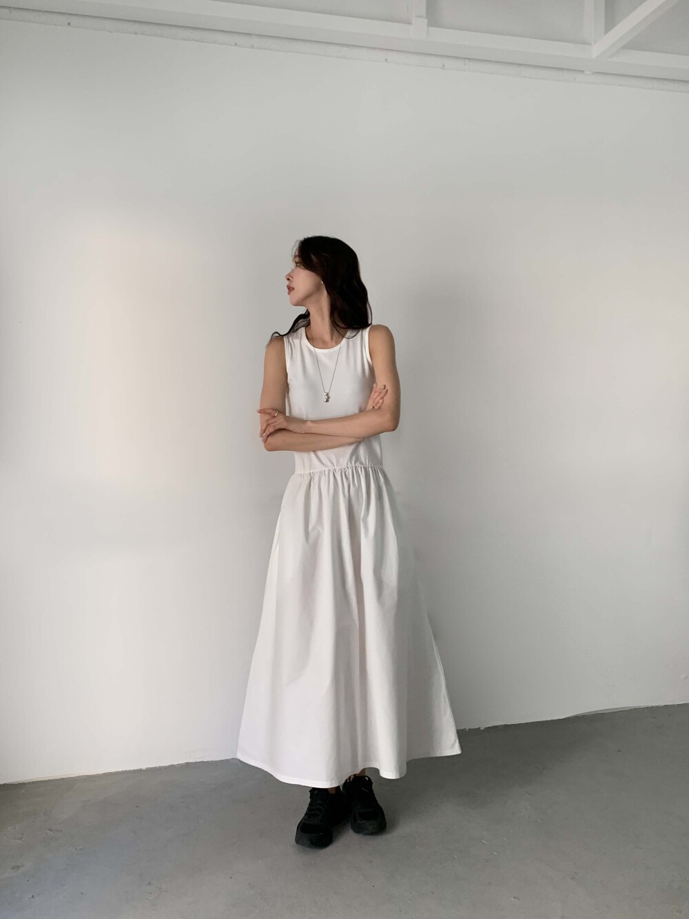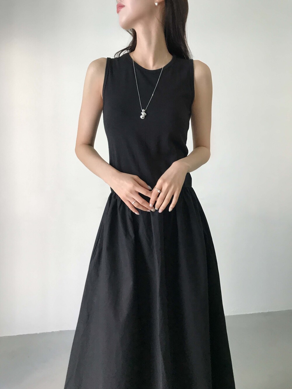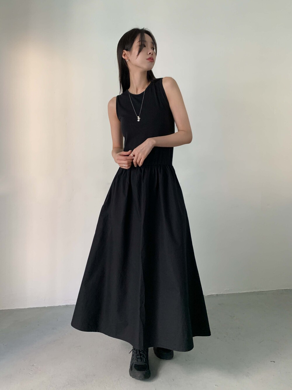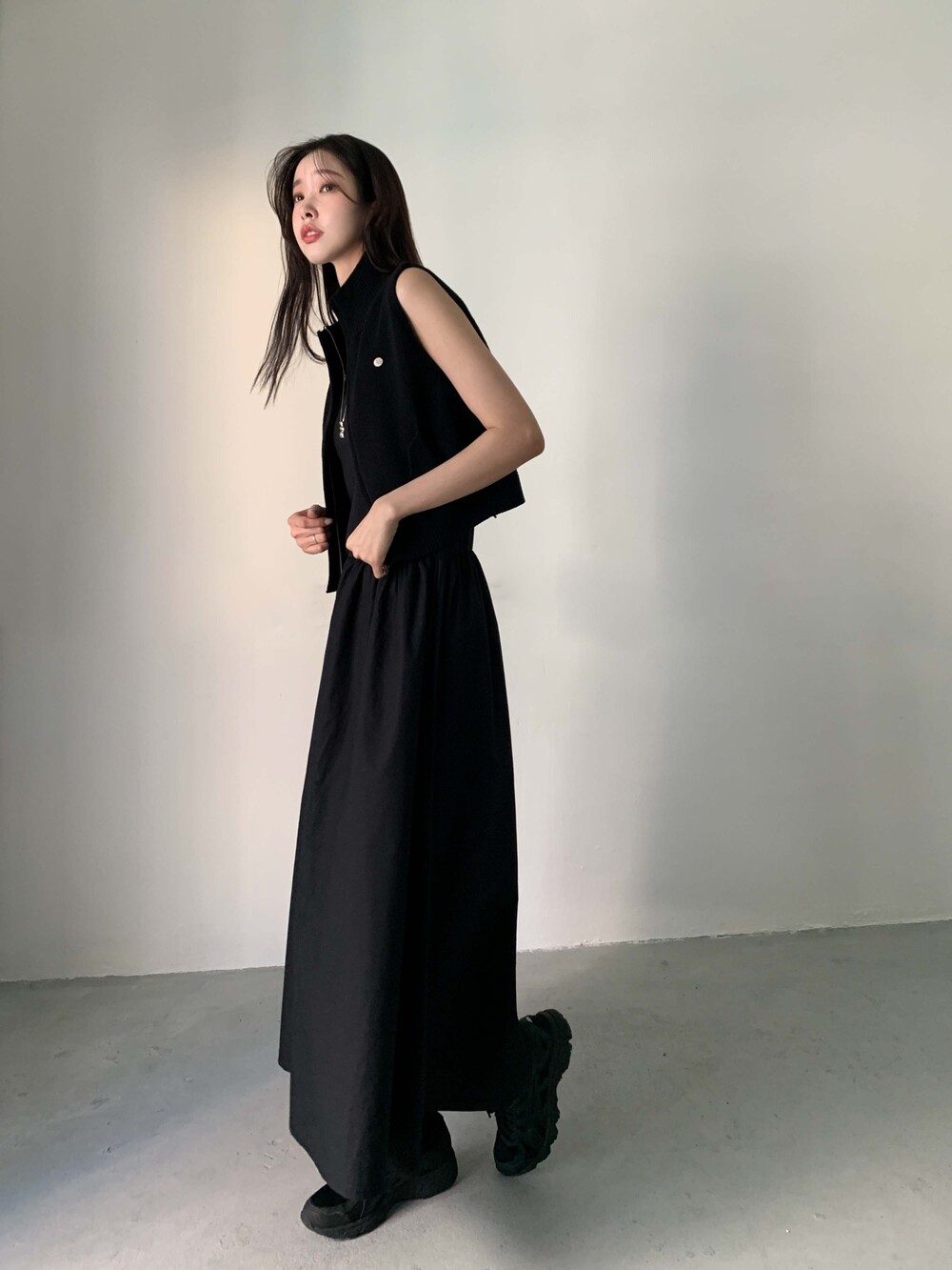 마치 기본 슬리브리스 탑에 롱 스커트를 매치한 듯한 느낌을