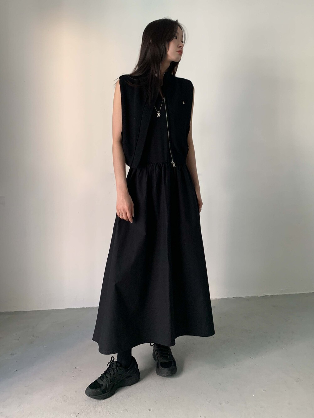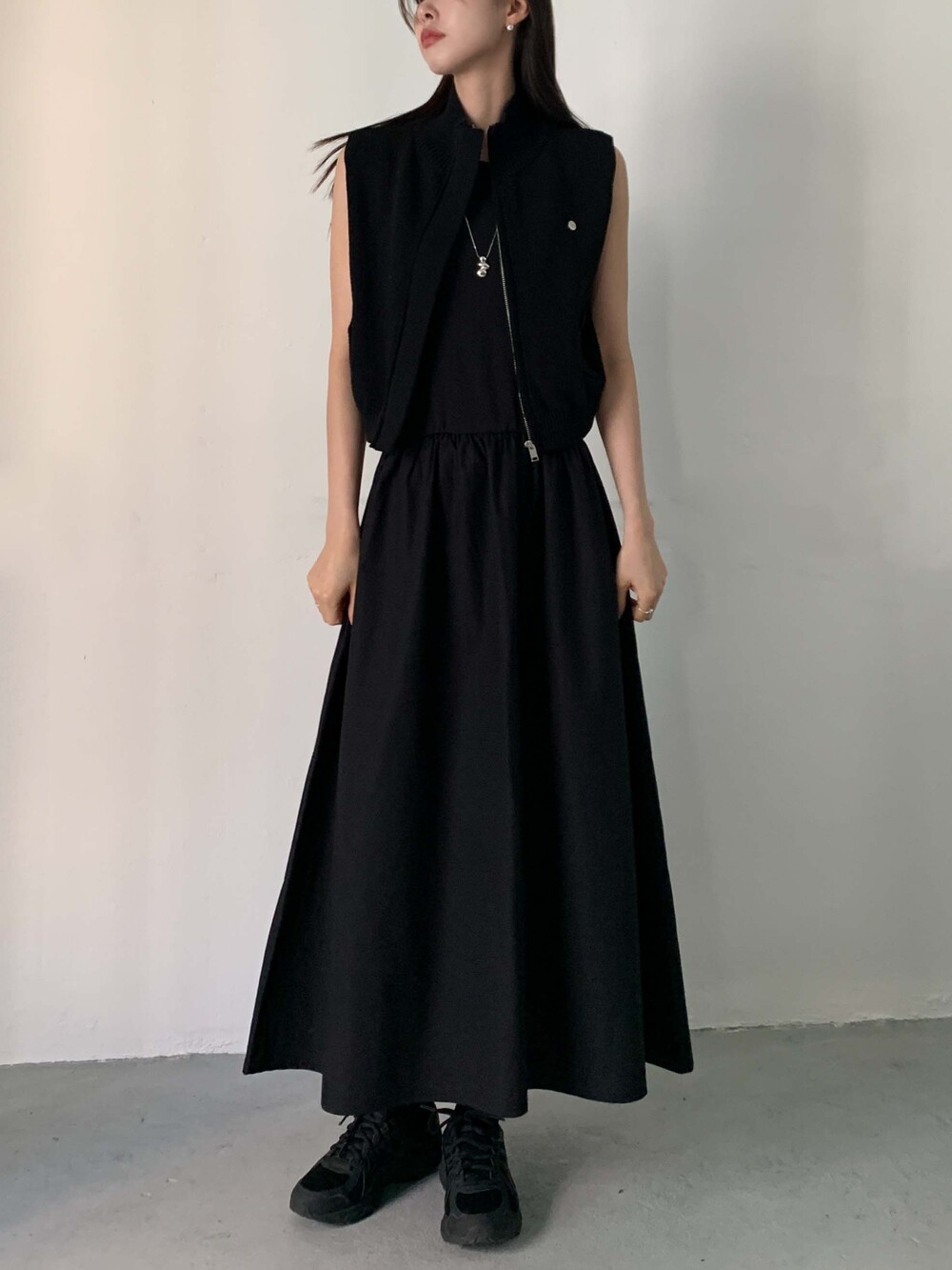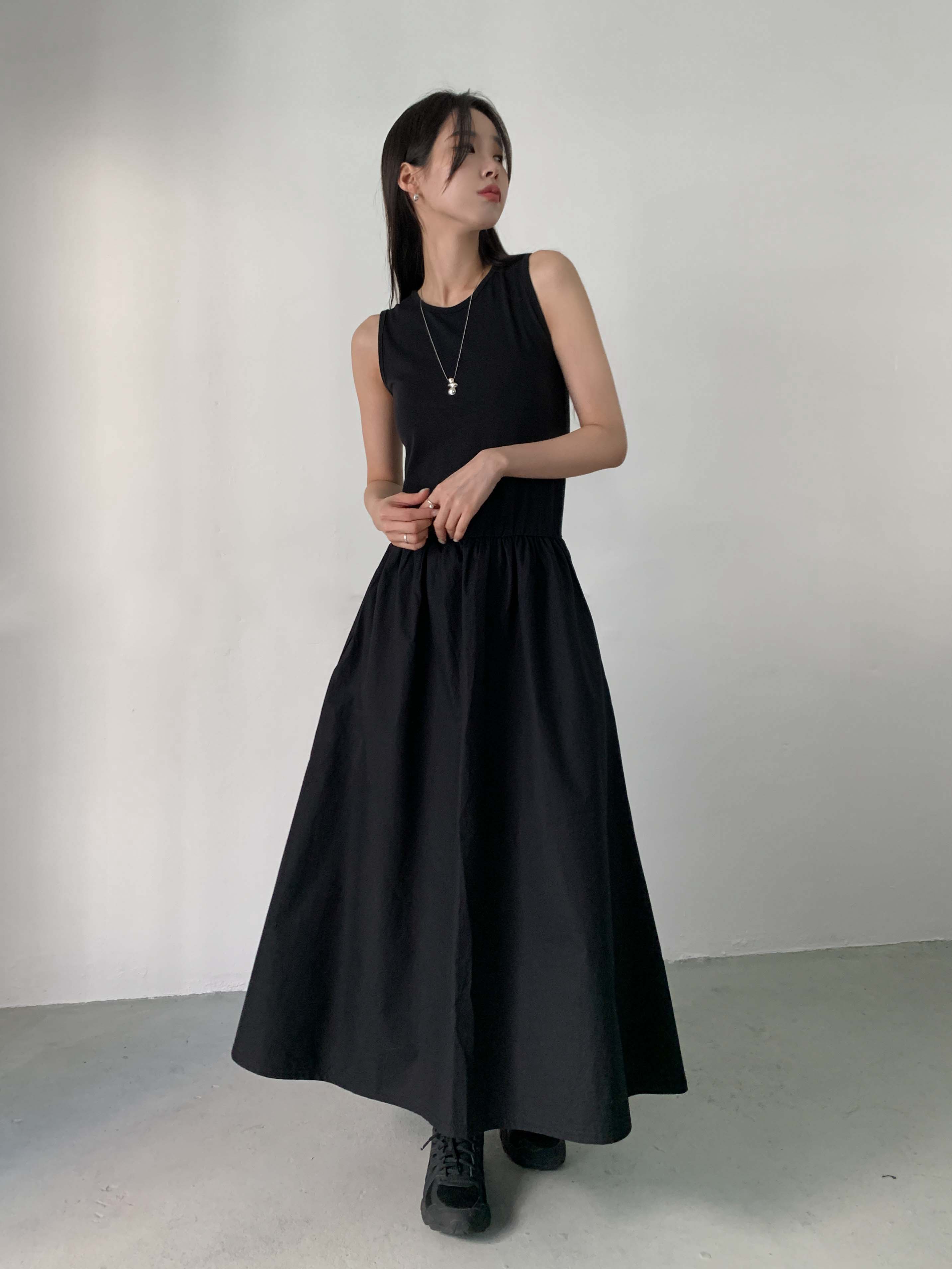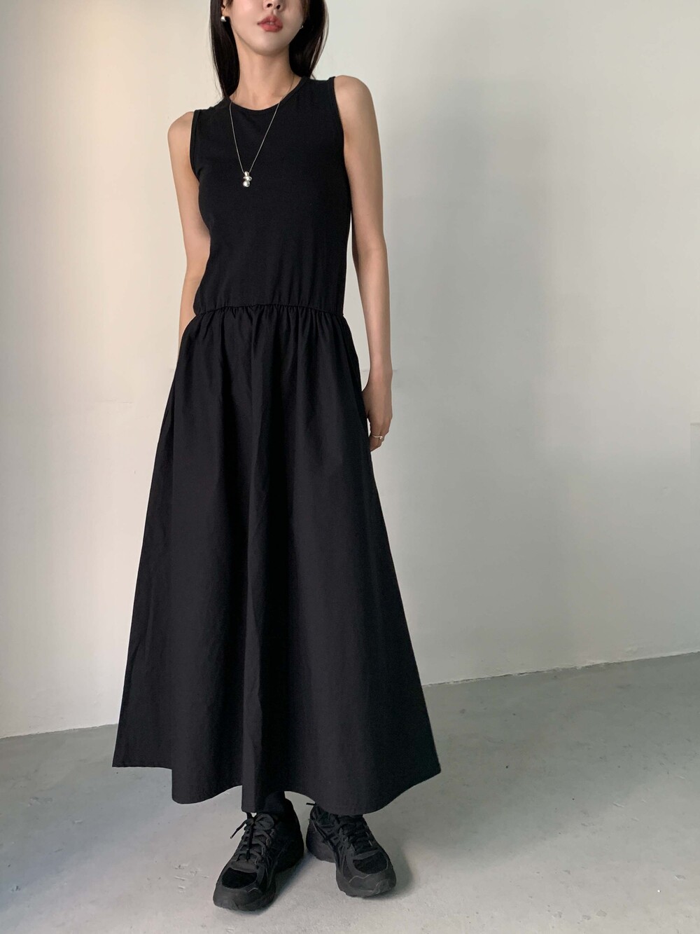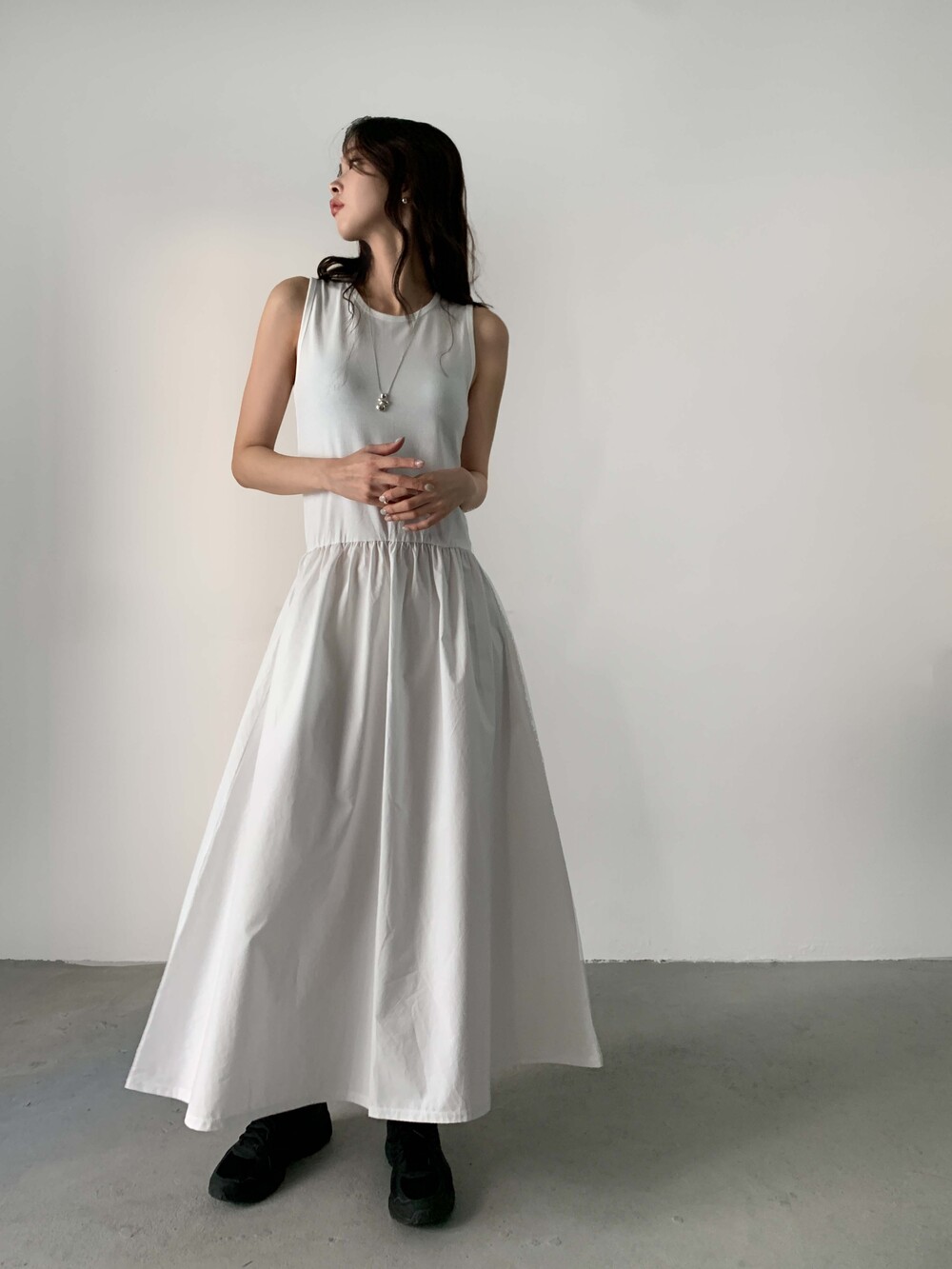 마치 기본 슬리브리스 탑에 롱 스커트를 매치한 듯한 느낌을