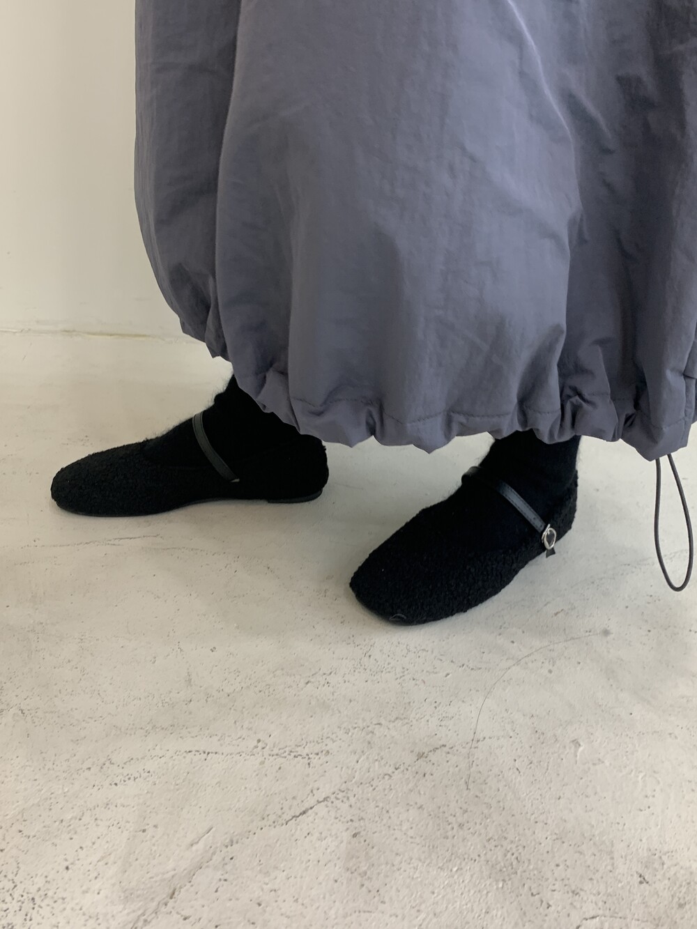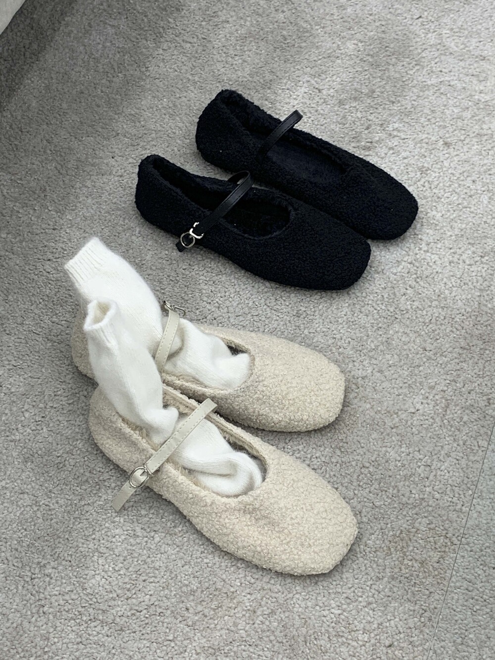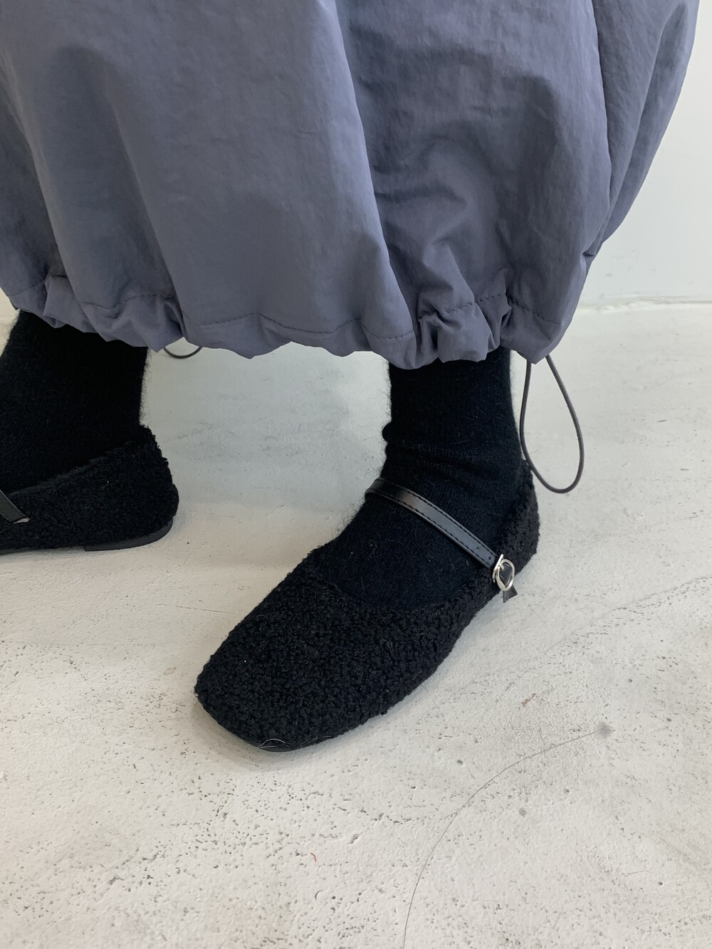 겨울 시즌에 잘 어우러지는 소재감의 메리 제인 플랫입니다.