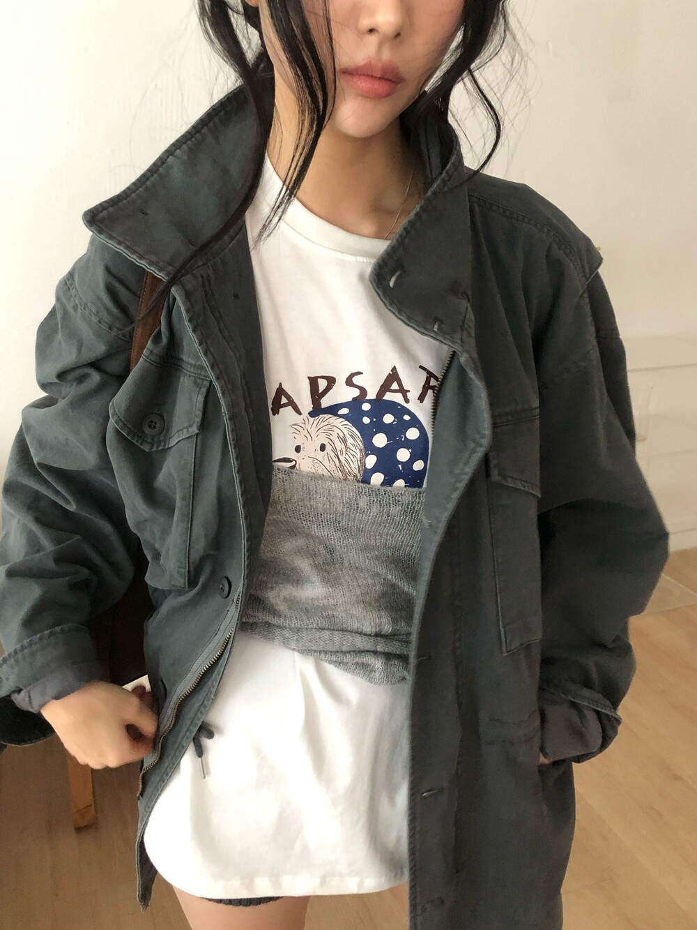어깨 55 가슴 60 밑단 62 소매 22.5 소매끝단 20 총장 71