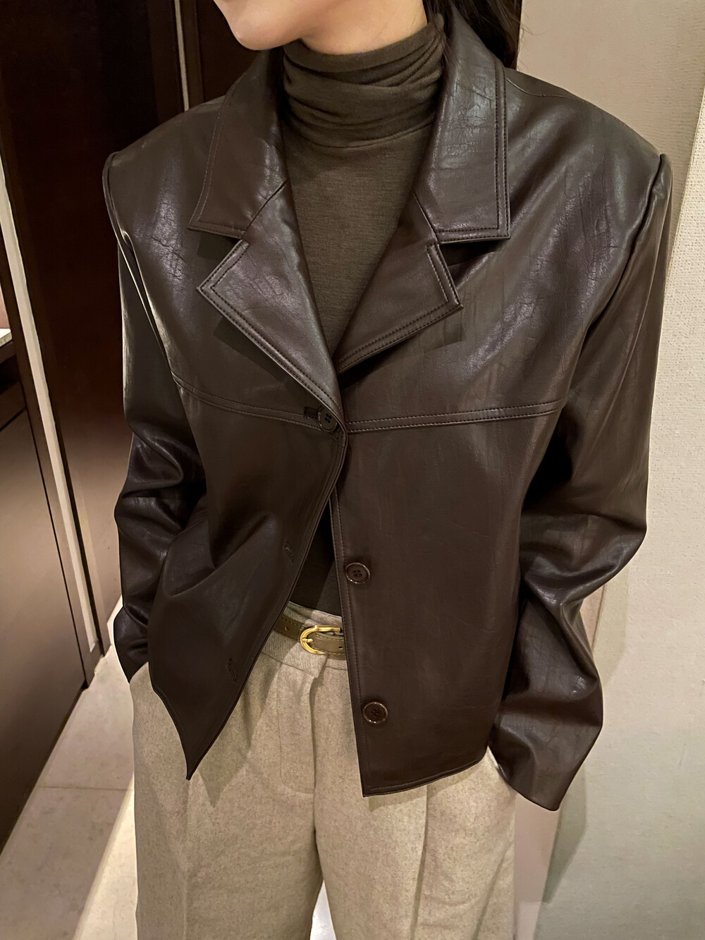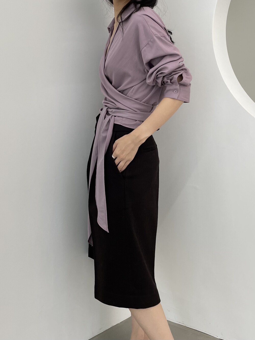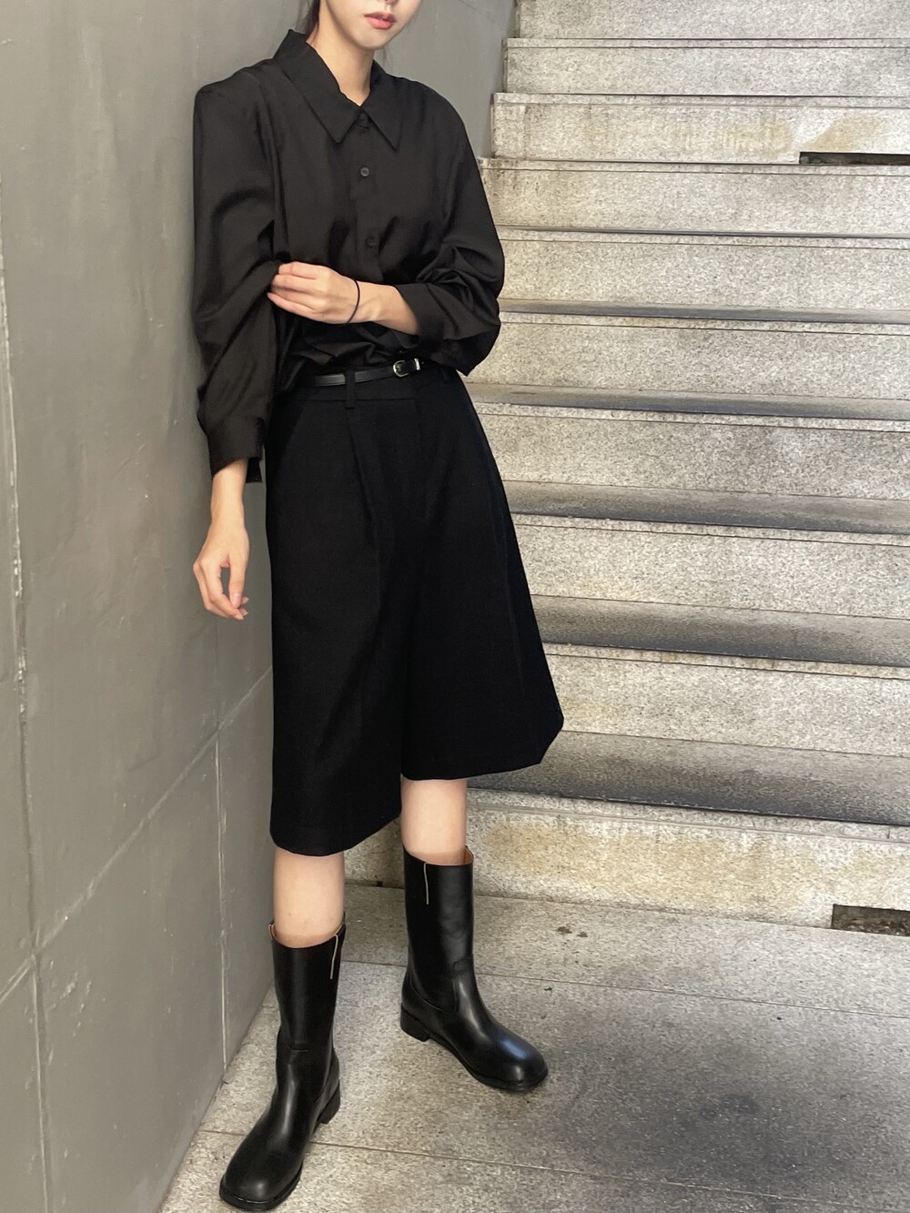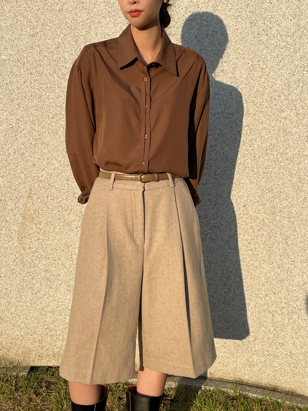원 핀턱이 밑단까지 내려와 핏을 깔끔하게 잡아줍니다.