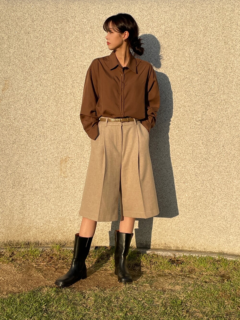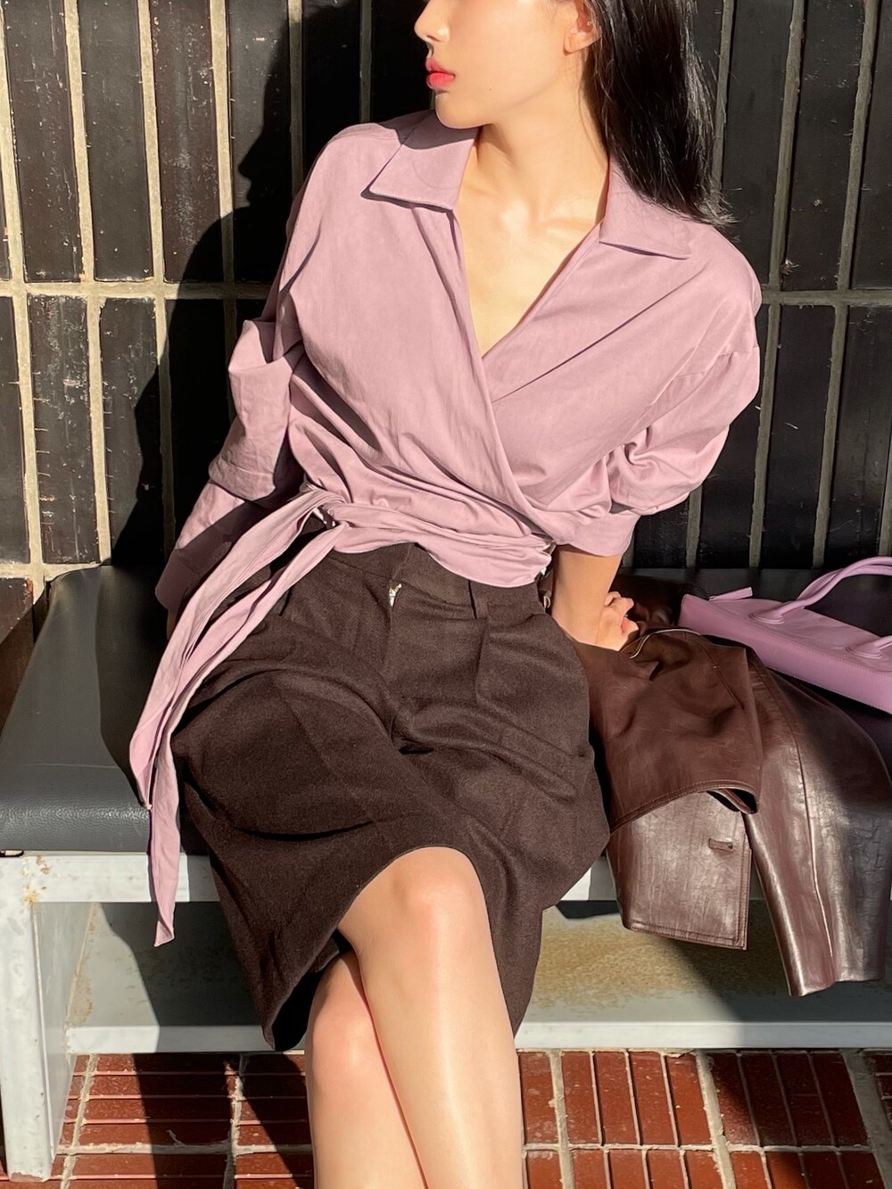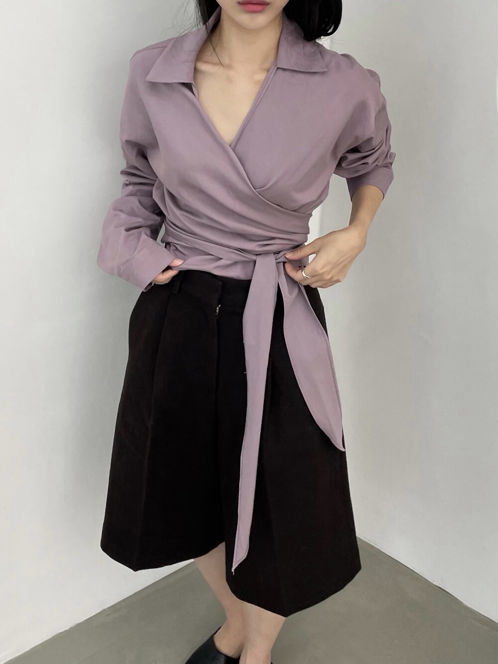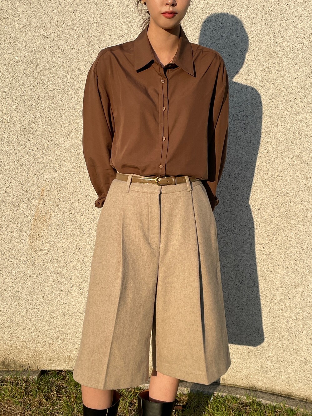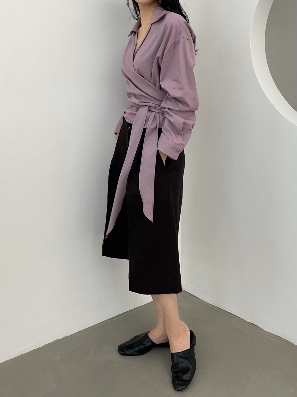 원 핀턱이 밑단까지 내려와 핏을 깔끔하게 잡아줍니다.